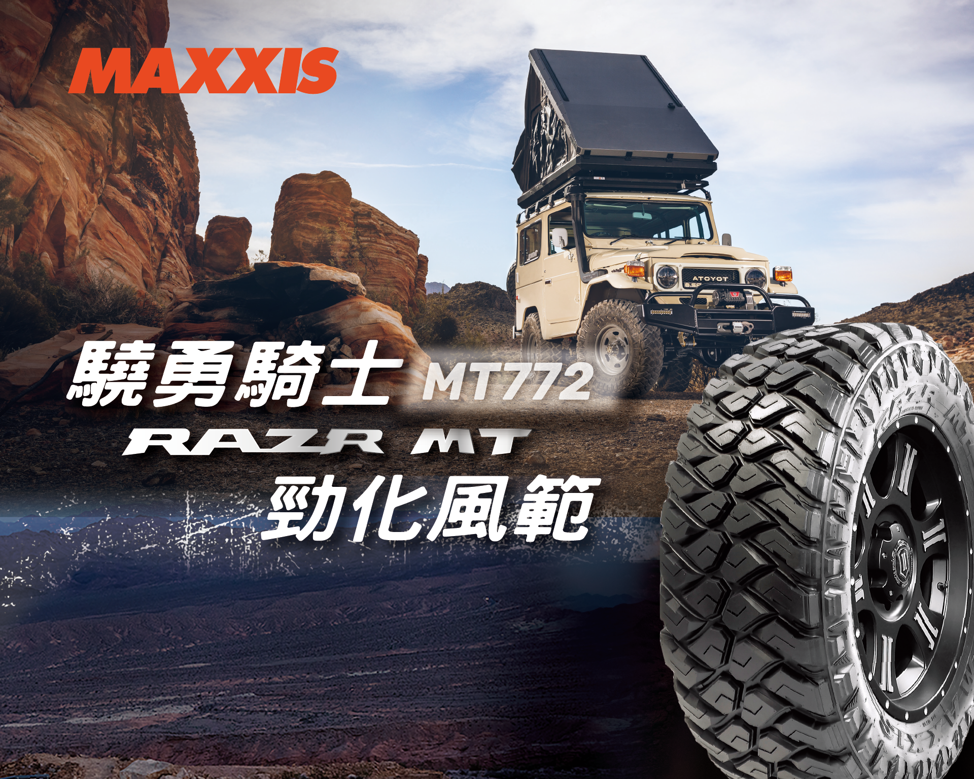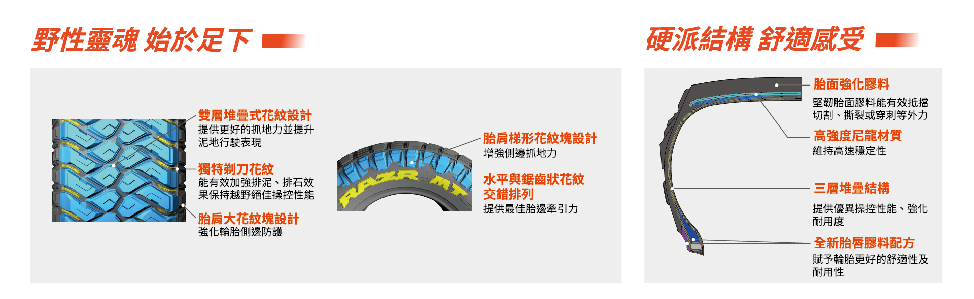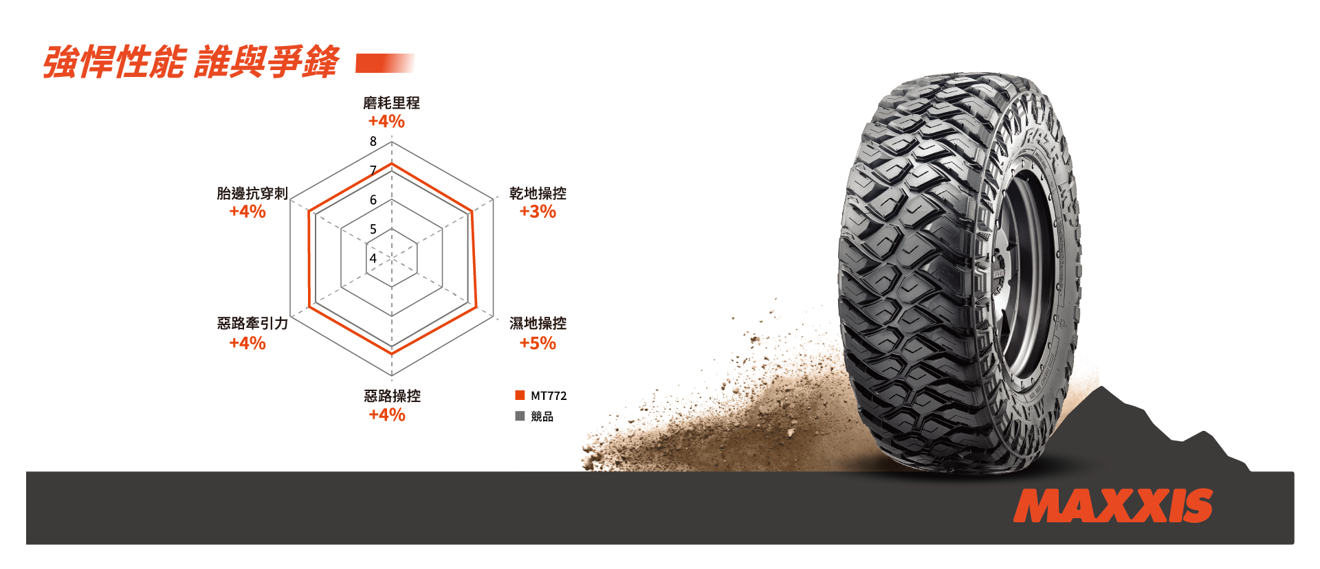 ●MT772 提升了胎面膠的抗損傷性,有助於抵抗切割,撕裂和碎裂。● 胎面採用高強度尼龍材質,提供高速穩定性。●胎體3層簾布設計,提供出色的操控性和耐用性。● 階梯狀Block 設計,增加泥濘地形中的牽引力表現。● 花紋中心特殊的凸塊設計,防止凹槽夾石。●胎肩階梯狀設計,增加惡路與泥濘地的牽引力。